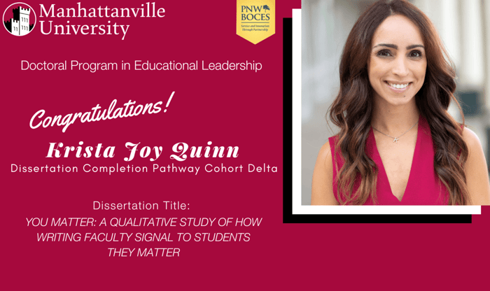 Congratulations to Krista Quinn who on Friday, April 12, 2024, confidently and successfully defended her dissertation. The title of Krista’s dissertation is: YOU MATTER: A QUALITATIVE STUDY OF HOW WRITING FACULTY SIGNAL TO STUDENTS THEY MATTER.